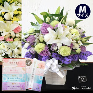 [冷蔵便]でお届け お供え生花アレンジメント〜ユリ入Mサイズと4種のお線香〜花げしき〜のセット お供え 花 フラワーアレンジ 線香 セット お悔やみ 贈り物 法事 お供え物 即日発送 供養 花 命日 四十九日 法要 一周忌 三回忌 花 お供え花 お盆 初盆 新盆 ギフト