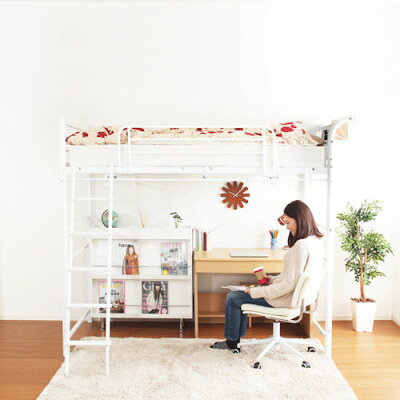 ベッド ベット ロフト シングル ホワイト 幅:100cm〜109cm 奥行き:200cm以上 高さ:180cm〜189cm キャスター無し 既成品 カジュアル シンプル デザイナーズ シングル 金属製 コンセント付き 棚付き 要組立品 白 ホワイト 220cm かっこいい おしゃれ 洋風 シンプル