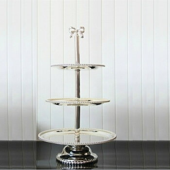 商品説明サイズ 大皿:Φ320mm 中皿:Φ270mm 小皿:Φ21.5mm 高さ:60-62cm 重量:2000g 色シルバー 商品説明 リボンがキュートな3段プレートです。